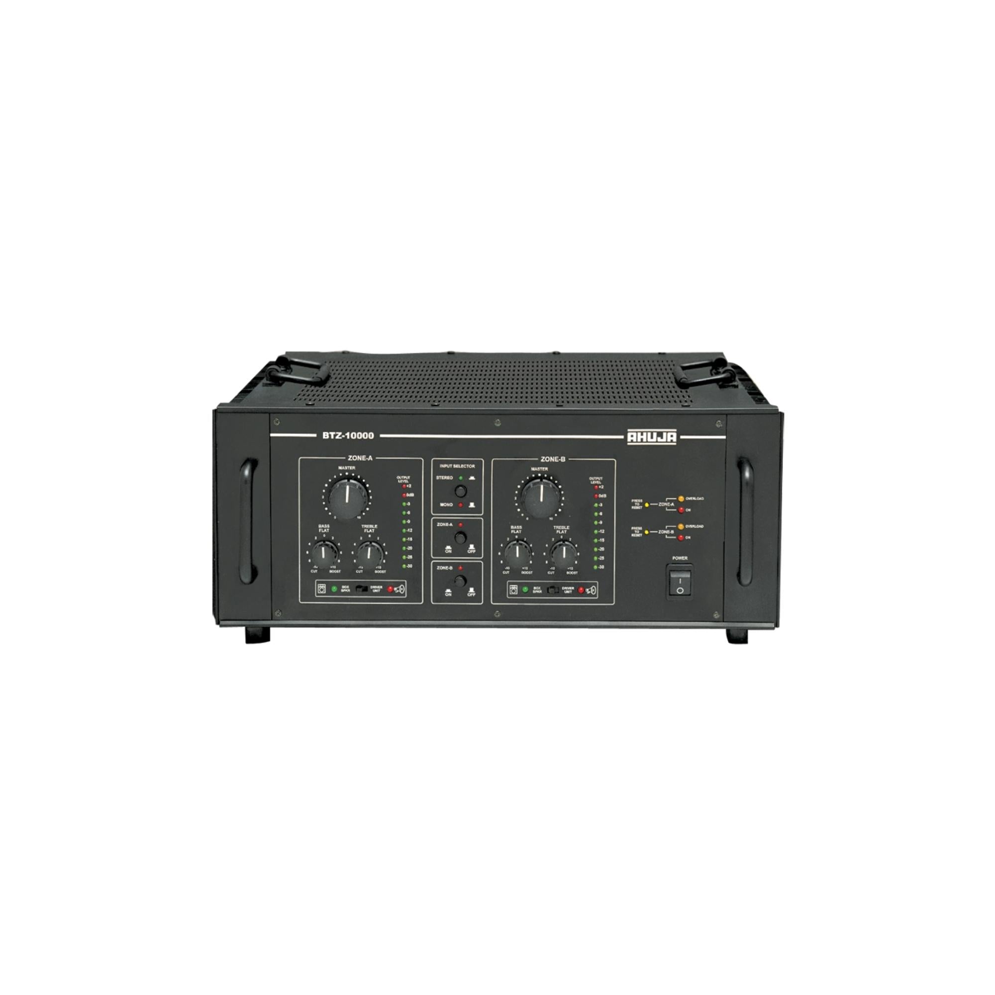 Ahuja model BTZ-10000 is rugged, reliable, cost-effective 1000 watts Two Zone Amplifier. BTZ-10000 is ideal for multi-speaker installations where a user needs to separately set power levels for two separate areas such as indoors & outdoors.