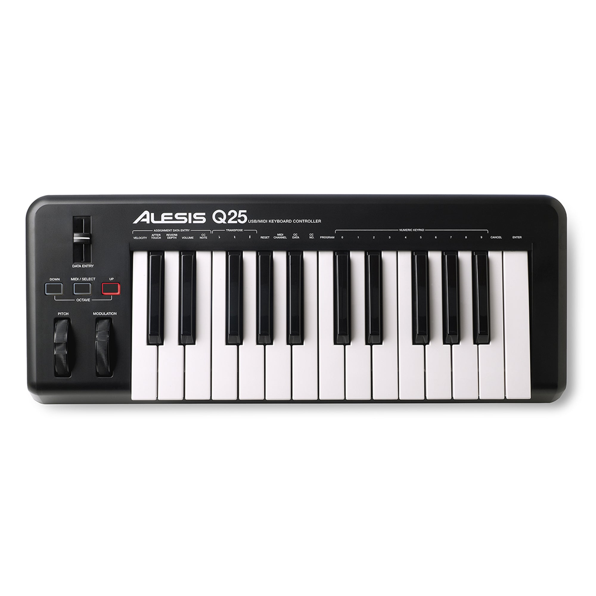 Simply connect the Alesis Q25 USB/MIDI Keyboard Controller to your computer with the included USB cable and you’re immediately ready to begin making music. A single USB cable supplies power and data connection, and you won’t even need to install drivers to make the Q25 work. The Q25 is class-compliant, which allows you to skip the programming and start playing instantly.
