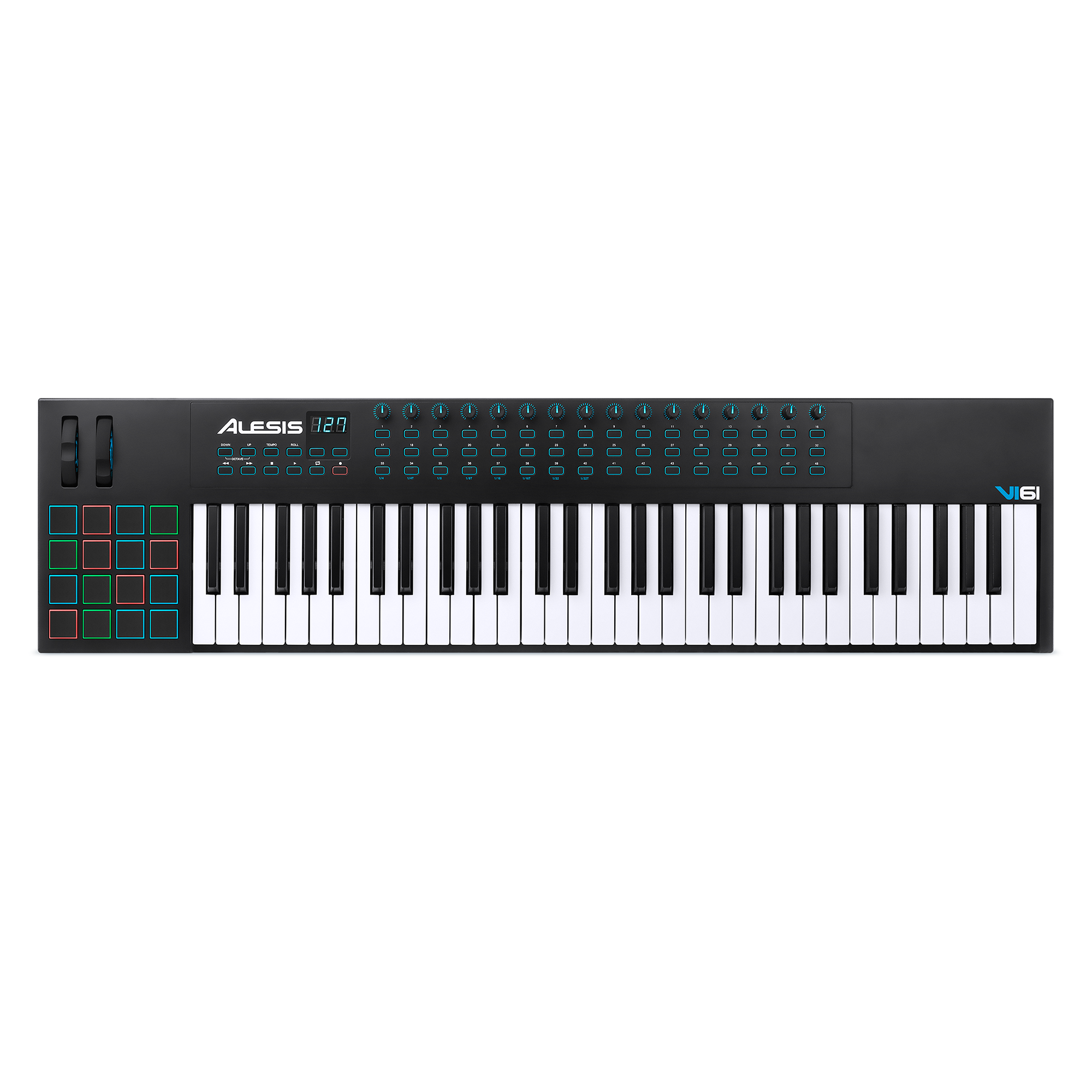 The Alesis VI49 USB/MIDI Keyboard Controller is an advanced USB/MIDI keyboard MIDI controller that lets you take command of your music software with a series of pads, knobs, and buttons. With 49 velocity-sensitive semi-weighted keys with aftertouch and Octave Up/Down buttons, you can expand the keyboard to the full melodic range and play bass lines, chords, and melodies. Alesis VI49 USB/MIDI Keyboard Controller also features 12 assignable knobs and 36 assignable buttons for manipulating effect plugins and virtual instruments: open and close filters, adjust volume levels, activate effects, tweak parameters, and more. 16 velocity-sensitive RGB trigger pads allow you to launch clips or finger drum with exceptional response and colorful visual feedback. Plus, pitch and modulation wheels expand the expressive capabilities of your performing.