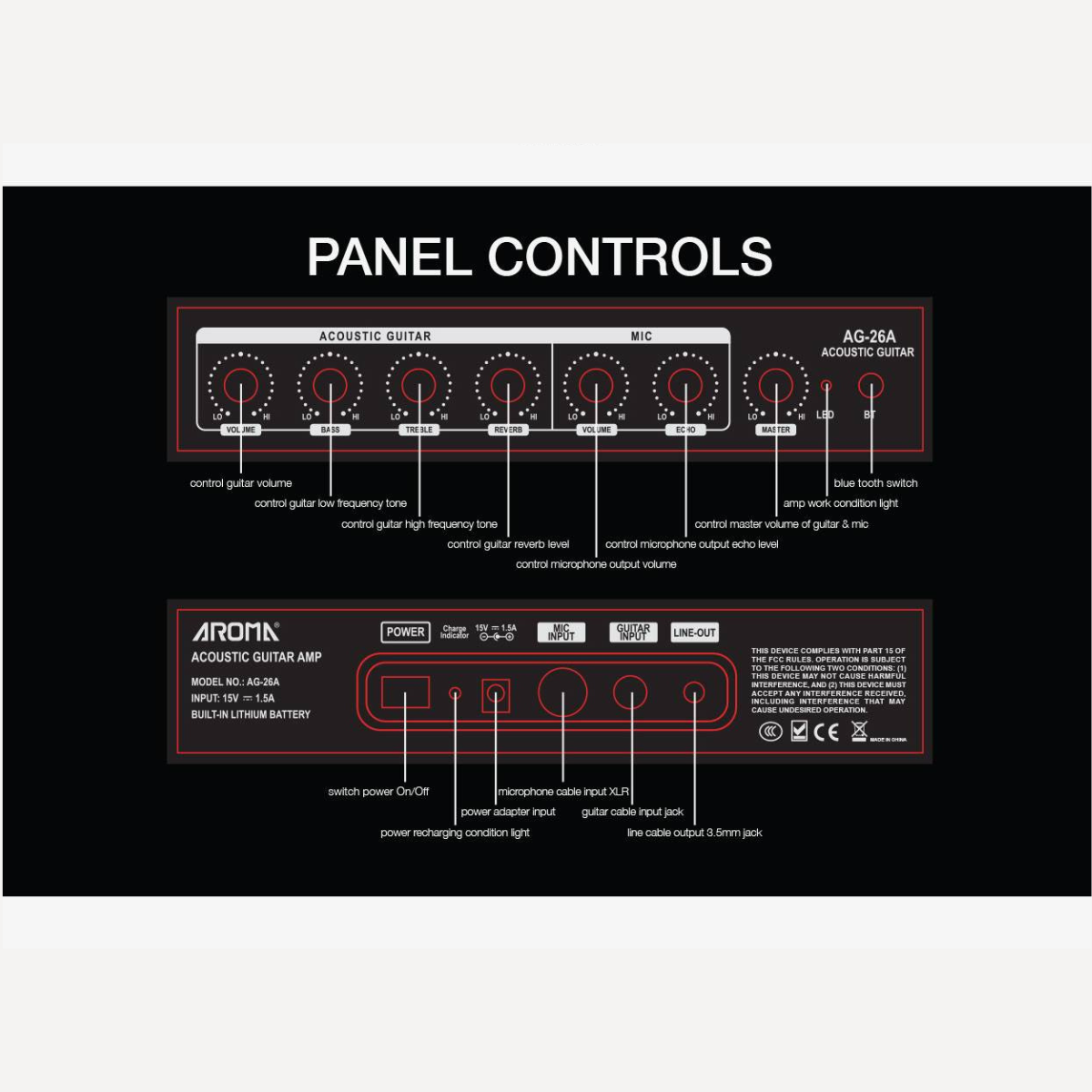 The Aroma AG-26A delivers solid performance in a small package. Whether you’re rehearsing at home, playing outdoors, or performing at a coffee shop, this amplifier ensures your acoustic tone is always clear, present, and reliable.