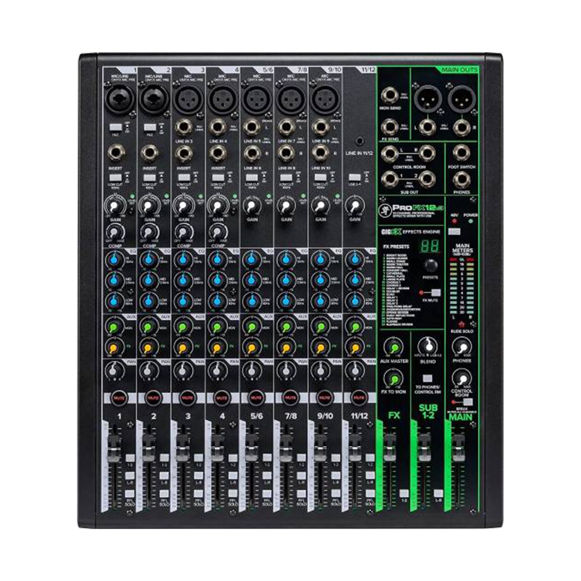 The Mackie ProFX12v3 is a 12-channel mixing console featuring seven Onyx microphone preamps with 60 dB of headroom and a built-in effects engine with 24 built-in FX, making it well suited for live sound, home recording, and content creators. The integrated 2x4 USB audio interface offers high-quality 24-bit / 192 kHz recording and playback with zero-latency monitoring.